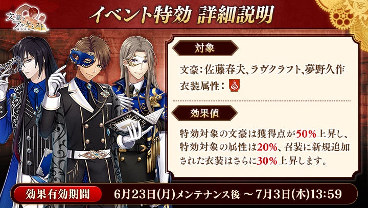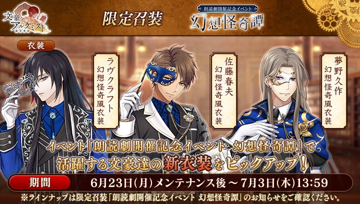さらに、イベントと同時に開催される限定召装『朗読劇開催記念イベント「幻想怪奇譚」』にて新規追加された「佐藤春夫」「ラヴクラフト」「夢野久作」の〈幻想怪奇風衣装〉を編成すると、得点の獲得率がそれぞれ30%上昇します。