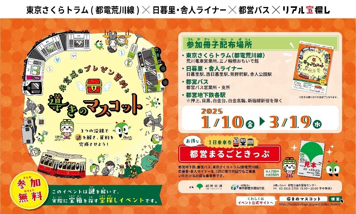 本イベントは、参加冊子に記載された謎を解き、都営交通沿線で集めた手がかりを頼りに宝箱を探し出す体験型イベントの第5弾です。今回から、これまでの謎解きエリアである東京さくらトラム(都電荒川線)と日暮里・舎人ライナーに、新たに都営バスも加わり、エリアが拡大しました。