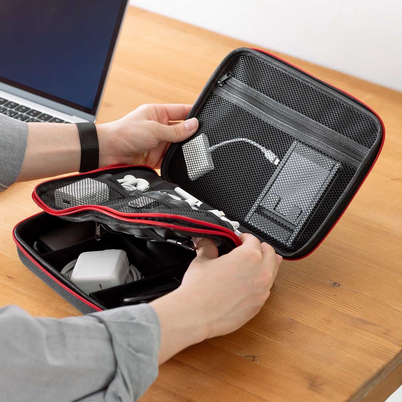 2層構造のガジェットポーチは、ケーブル・充電器・マウスなどを整理整頓して持ち運べます。内部はメッシュポケットやゴムバンドで小物が散らばらず、見やすく取り出しやすい設計。ビジネスシーンでも旅行でも、必要なアイテムをスムーズに取り出せる快適さを実現します。