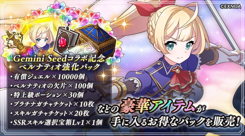 さらに「Gemini Seedコラボ記念 ベルナティオ確定パック」を購入すると「Gemini Seedコラボ記念 ベルナティオ強化パック」が購入可能になります!こちらの商品では「ベルナティオの欠片」や有償ジュエルに加えて、「プラチナガチャチケット」や「SSRスキル選択宝箱」、「特上級ポーション」など様々な豪華アイテムをお得に獲得することができます!