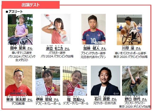 この度、イベントに出演いただくゲストやコンテンツの詳細が決定しました。パリ2024パラリンピックの車いすテニス金メダリストの田中 愛美(まなみ)さんや東京2025デフリンピックでの活躍が期待されるアスリートなど、多くのゲストアスリートがステージ企画や競技体験ブースに登場します