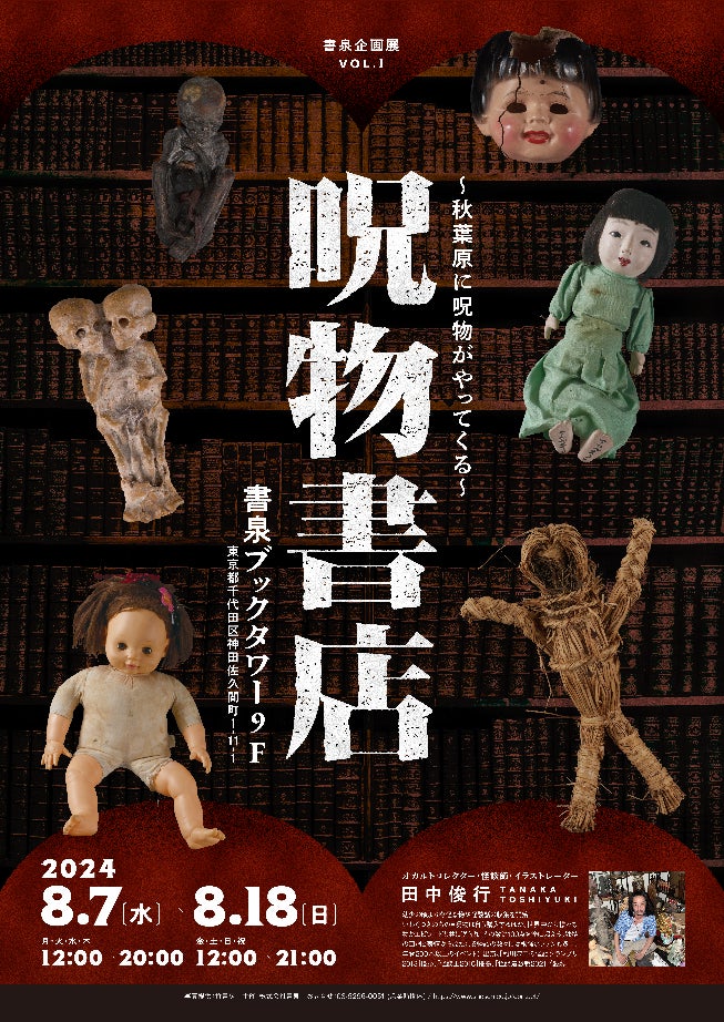 “怪異”と“書店”の融合をお楽しみいただける「呪物書店」では、オカルトコレクターであり、作家、怪談師でもある田中俊行氏の呪物コレクション展を2024年8月7日(水)から8月18日(日)までの期間、書泉ブックタワー 9階のイベントスペースにて開催します。