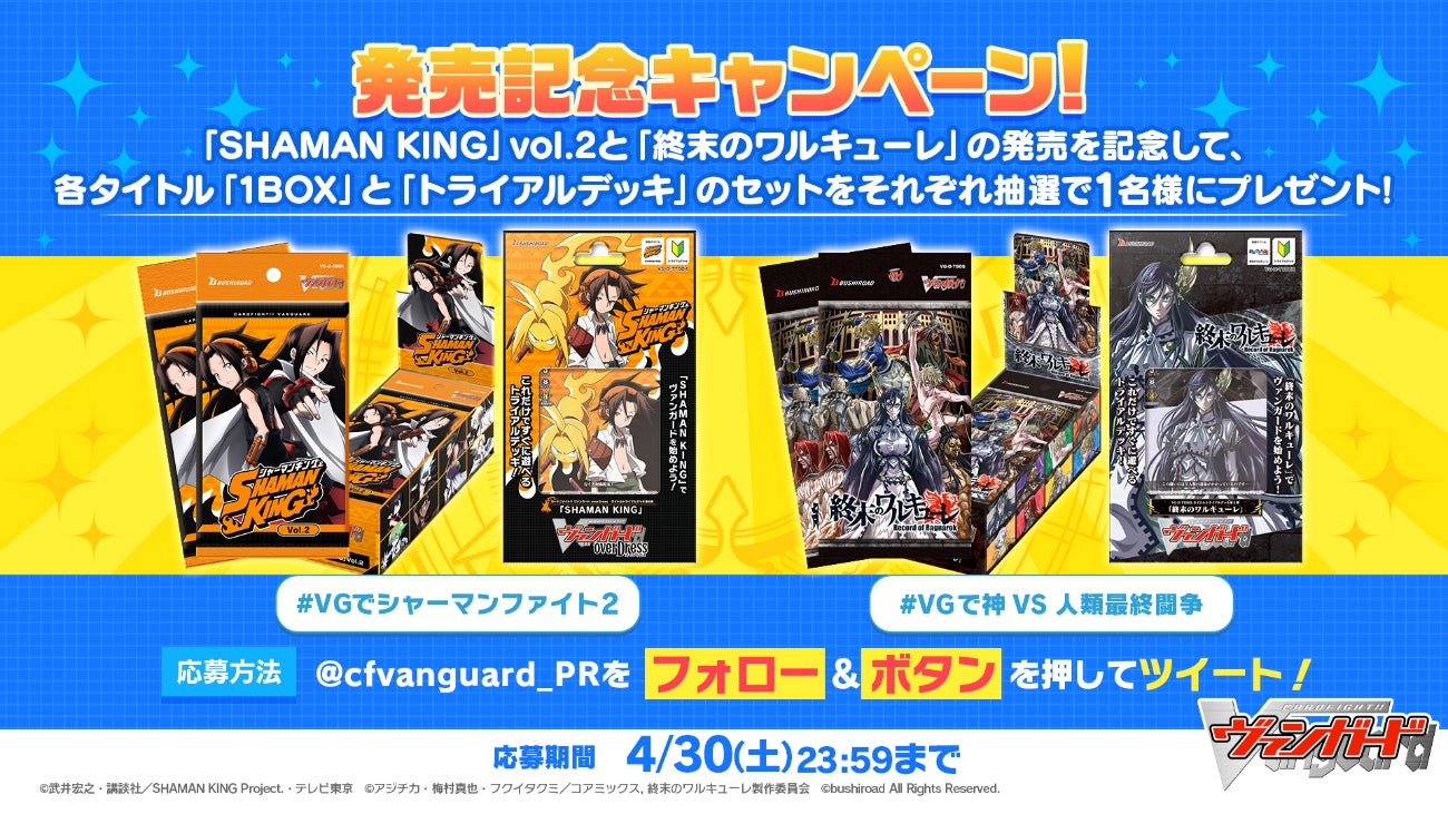 タイトルブースター第4弾「SHAMAN KING」Vol.2 1BOXとタイトルトライアルデッキ第4弾 「SHAMAN KING」1つのセット、タイトルブースター第5弾「終末のワルキューレ」 1BOXとタイトルトライアルデッキ第5弾「終末のワルキューレ」1つのセットをそれぞれ1名様にプレゼント