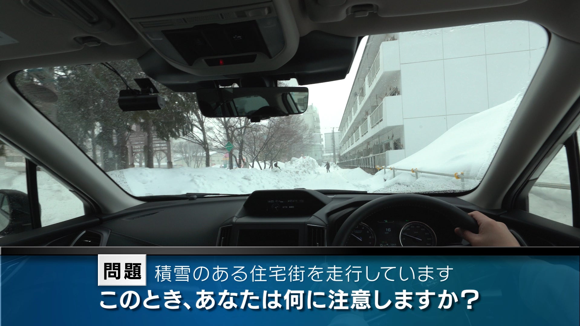 積雪のある住宅街を走行しています。