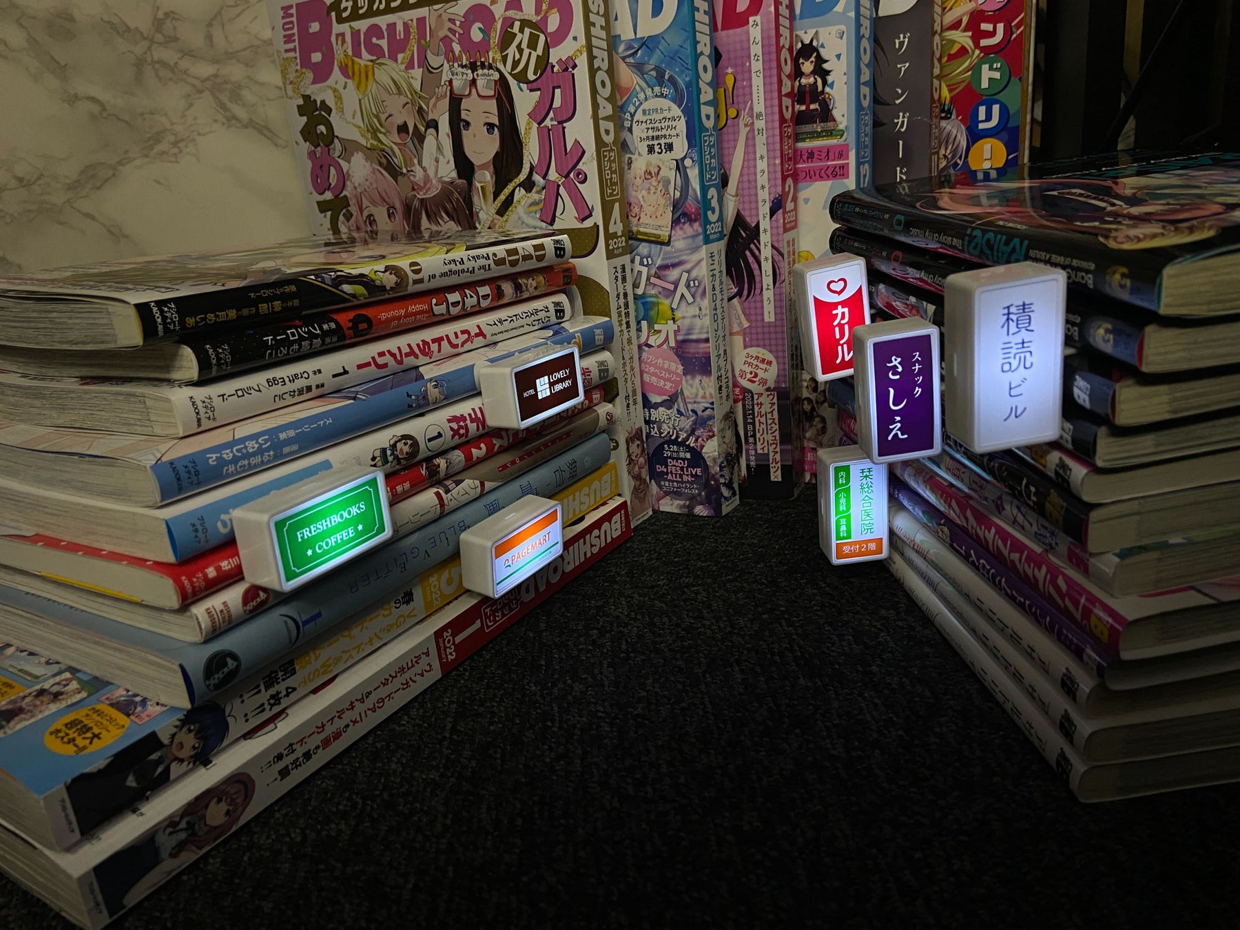 このビル看板を用いることで、身の回りに溢れる積読をたちまちインテリアへと昇華でき、新たな本も気兼ねなく買い足すことができるようになります。