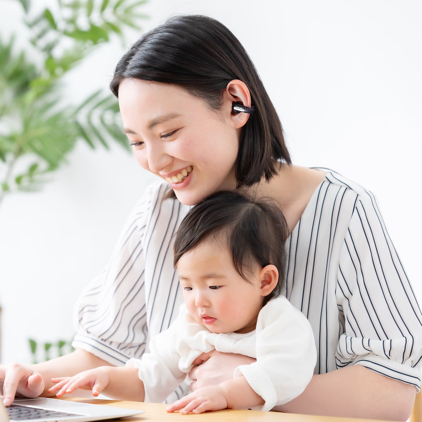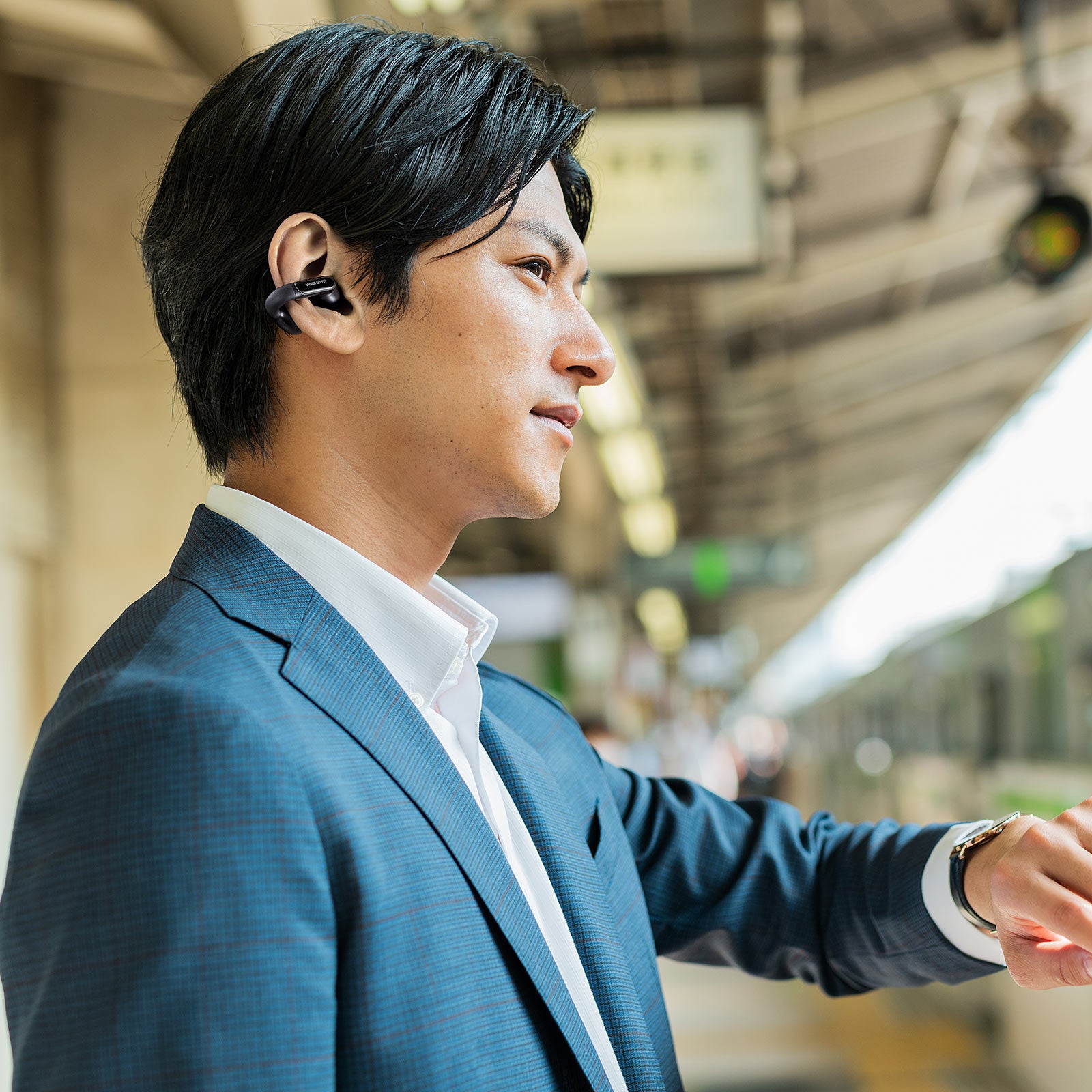 片耳わずか約5.5gの超軽量設計。耳への負担を軽減し、通勤やテレワーク、運動など多様なシーンでストレスフリーに使用可能です。ネックバンドや耳掛け式と違い、後頭部やメガネに干渉せず、自由度の高い快適な装着感を楽しめます。