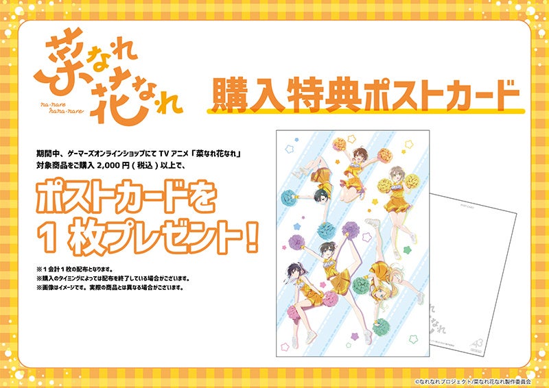 期間中、ゲーマーズオンラインショップにてTVアニメ「菜なれ花なれ」対象商品をご購入2,000円(税込)以上で、ポストカード(全1種)を1枚プレゼント!