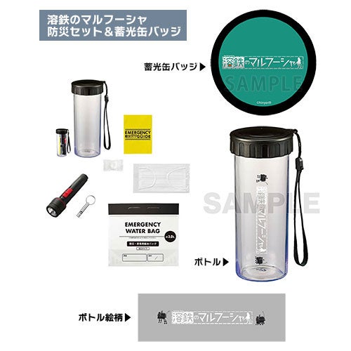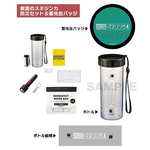 ボトル/ウォータバッグ/LED防災ライト/ホイッスル/圧縮タオル/マスク/防災ガイド/蓄光缶バッジ