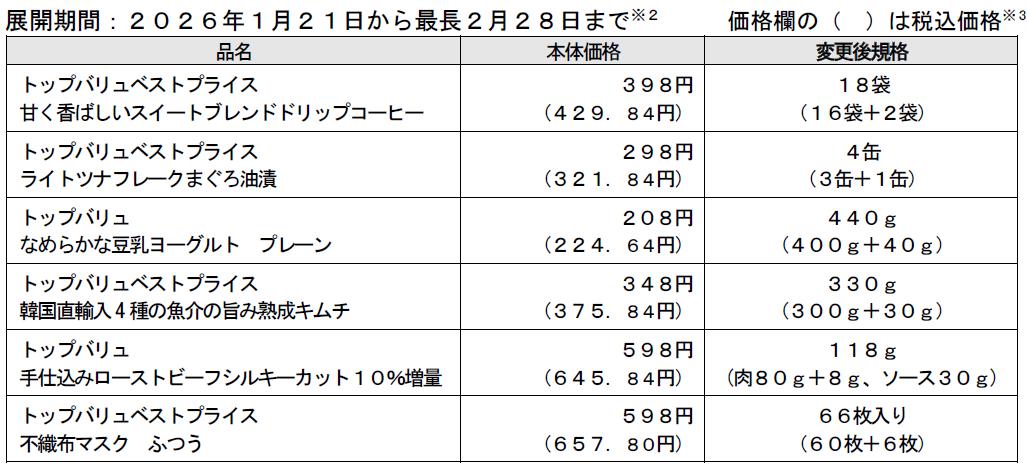 日々の買い物を通じて支出への関心が高まるなか、家計負担を意識し、これまで以上に計画的に商品を選ぶ動きが広がっています。こうした中イオンは、日常の食卓や家事に欠かせない商品を中心に「少しでも家計のお役に立ちたい」「いつもの商品が増量というちょっとした楽しみをご提案したい」「トップバリュ商品をお試しいただいたことのない方に、商品を知っていただくきっかけにしてほしい」という思いを込め、期間・数量限定で増量します。