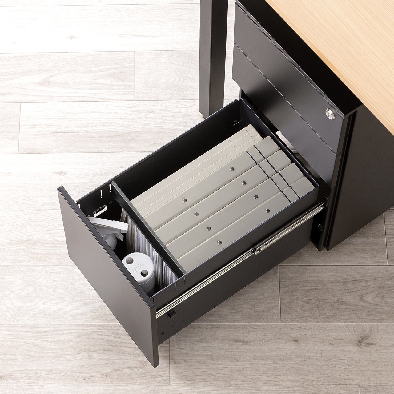 セキュリティ面も安心の一括ロック対応。鍵ひとつで3段すべてを施錠でき、個人情報や大切な書類を安全に守ります。シェアオフィスや在宅勤務でも、プライバシーを確保できる心強い味方です。