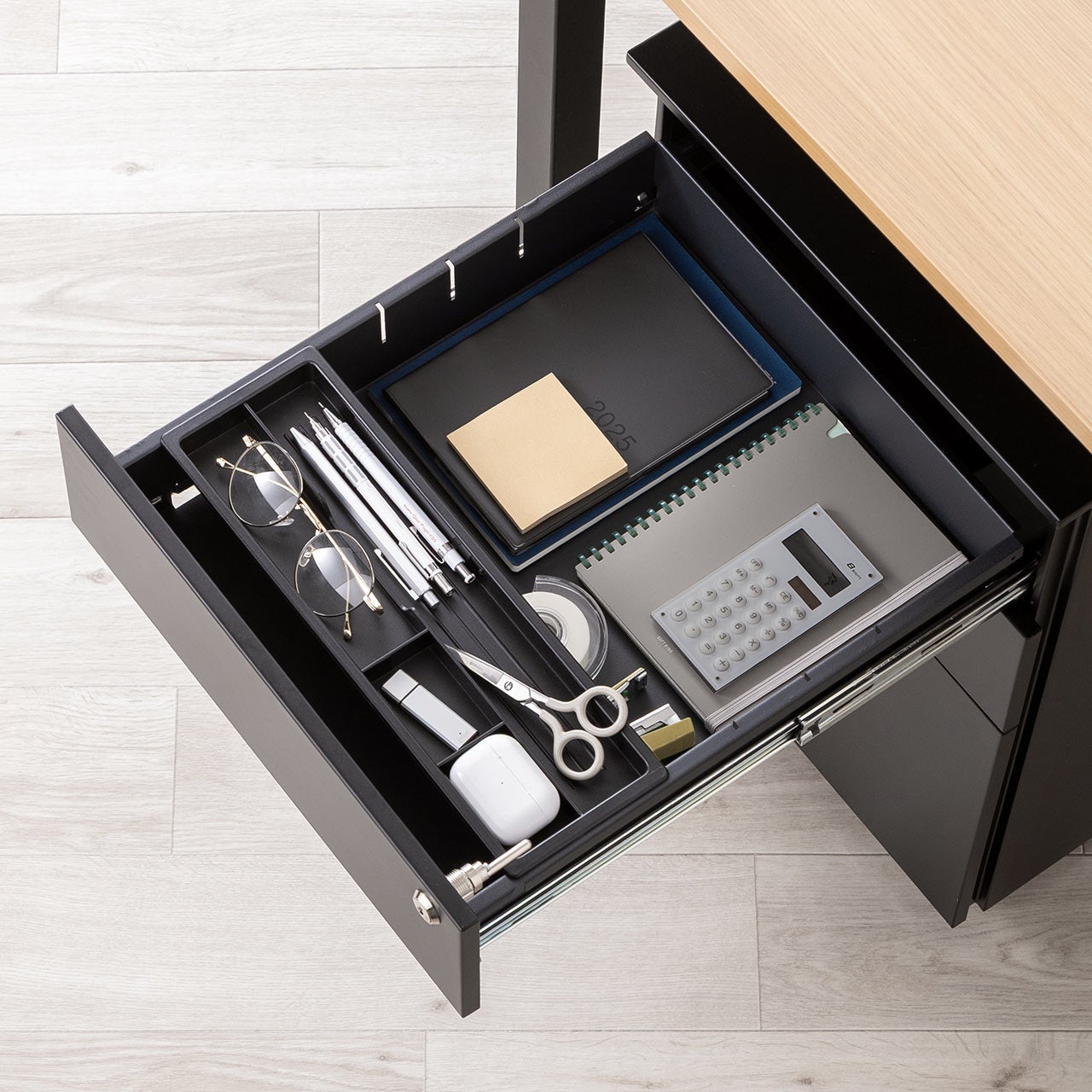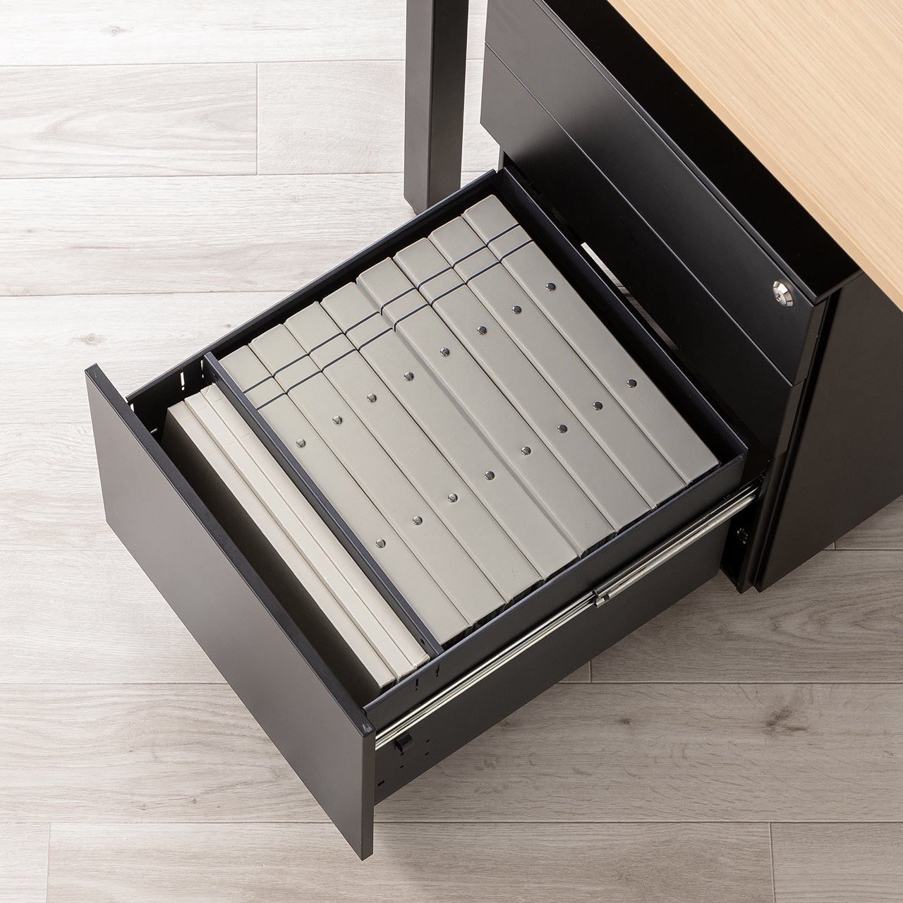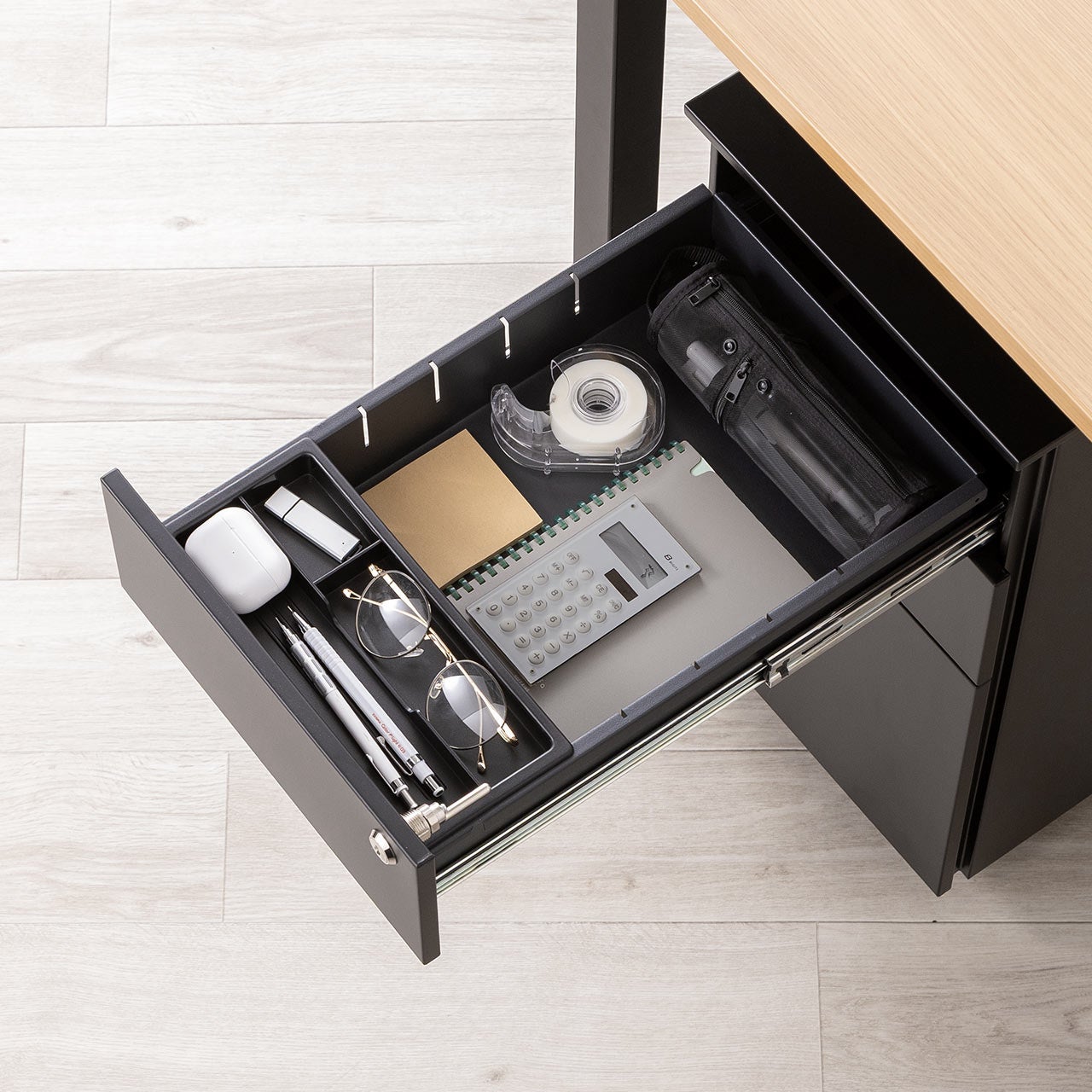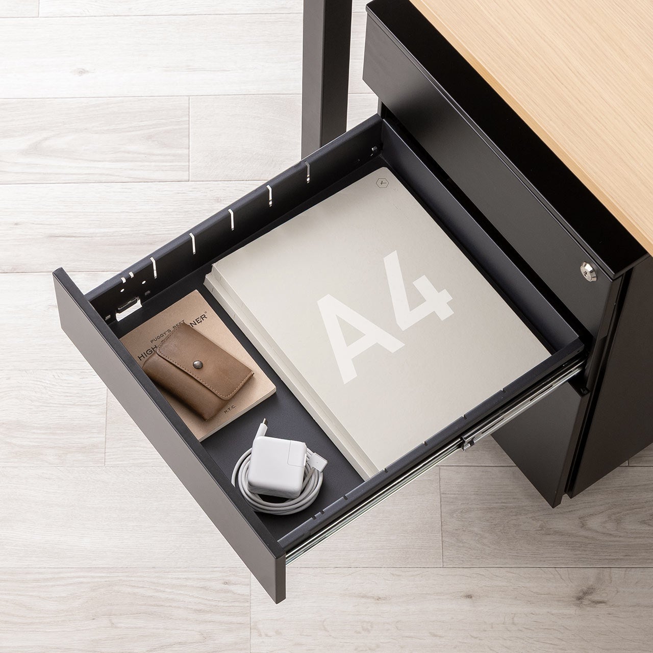 上段には小物整理に便利なペントレー、下段には仕切り板が付属。中段・下段にはA4ファイルを収めることができます。文具からA4サイズのファイルや書類まで効率的に収納できます。引き出しはダブルスライドレール仕様で、奥までしっかり引き出せる快適設計です。