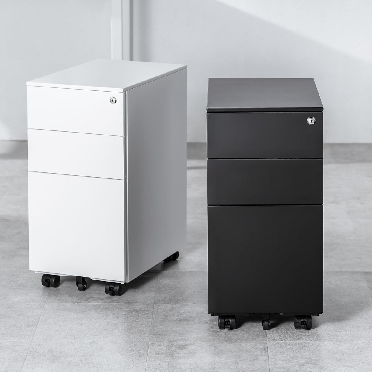 デスクサイドに収まりやすい幅30cmのスリム設計と、しっかり収納できる幅39cmの2タイプから、自分の環境にあったサイズを選択可能。カラーもブラックホワイトの2種類から選択可能で、在宅ワークの小さなデスクからオフィスの共有スペースまで違和感なく設置ができます。