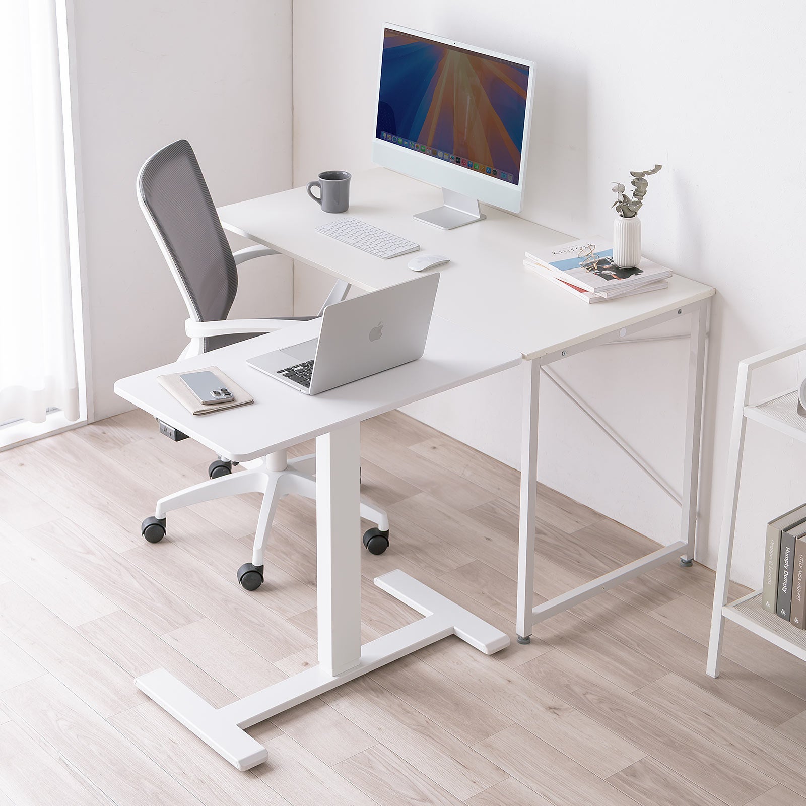 ボタン操作ひとつで簡単に昇降が可能。姿勢や作業内容に合わせて高さを変えられるため、腰や肩の負担軽減にもつながります。立ち作業と座り作業を切り替えながら効率的に仕事を進められる点も大きな魅力です。