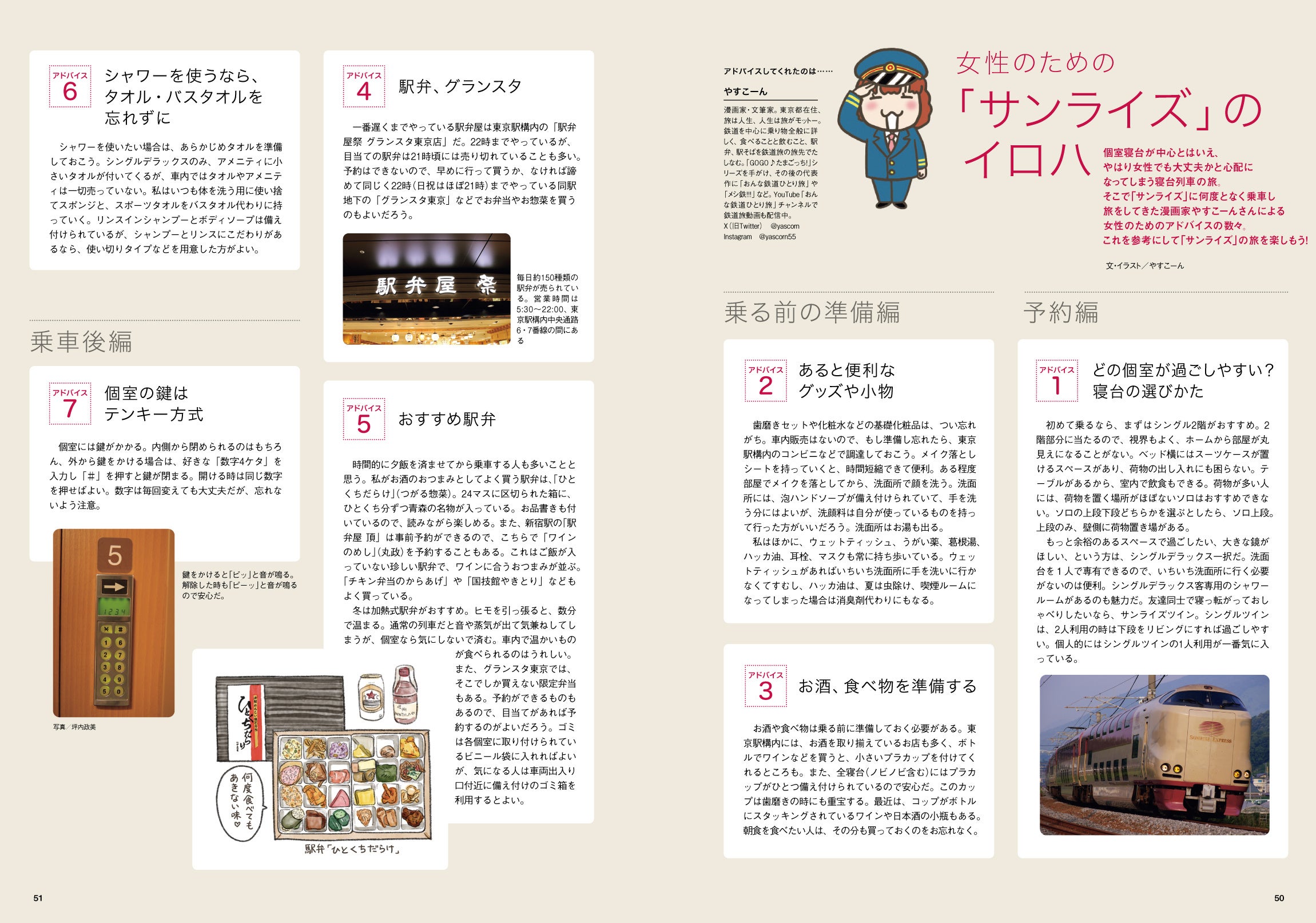 個室といっても女性ひとり旅でも大丈夫? など気になるところを女性視点で解説。お化粧はどこでする? 部屋の温度は? 個室のロックのかけ方は? ドライヤーは使える? など、乗車前に知っておくと安心できるアドバイスが満載です。