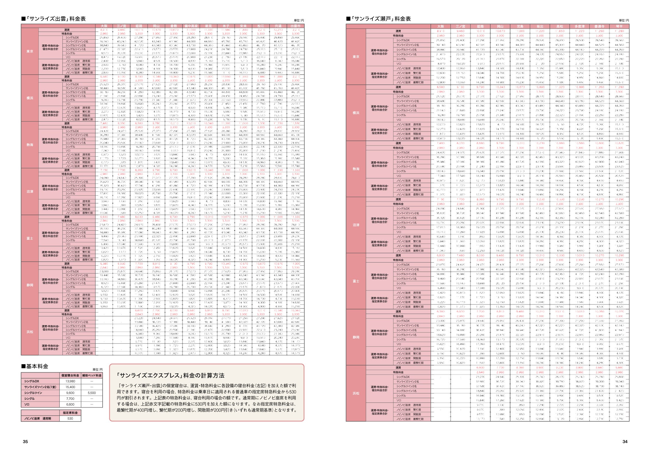 「サンライズエクスプレス」の基本的な情報を網羅。運行ルート、ダイヤだけではなく、沿線の日の出の時間や車窓の風景までをわかりやすくまとめています。少々わかりにくい乗車に必要な金額については、運賃+特急料金∔寝台券の合計を、区間別かつ寝台の種類別で一目瞭然となる一覧表としてまとめました。