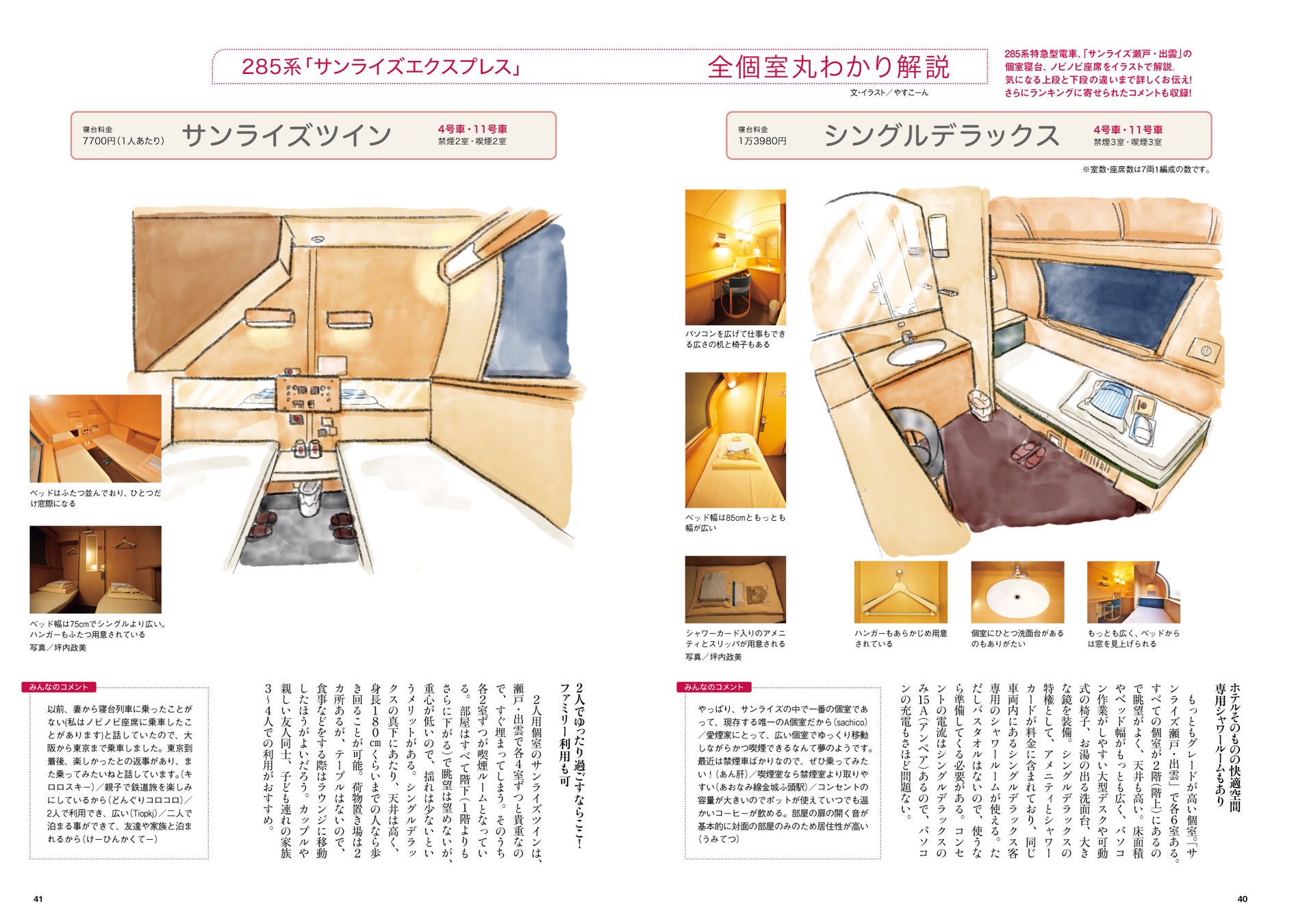 車内については、寝台番号までわかるよう平面図イラストとともに詳細に図解。また個室内の様子は、漫画家やすこーんさんのイラストとともに解説しています。