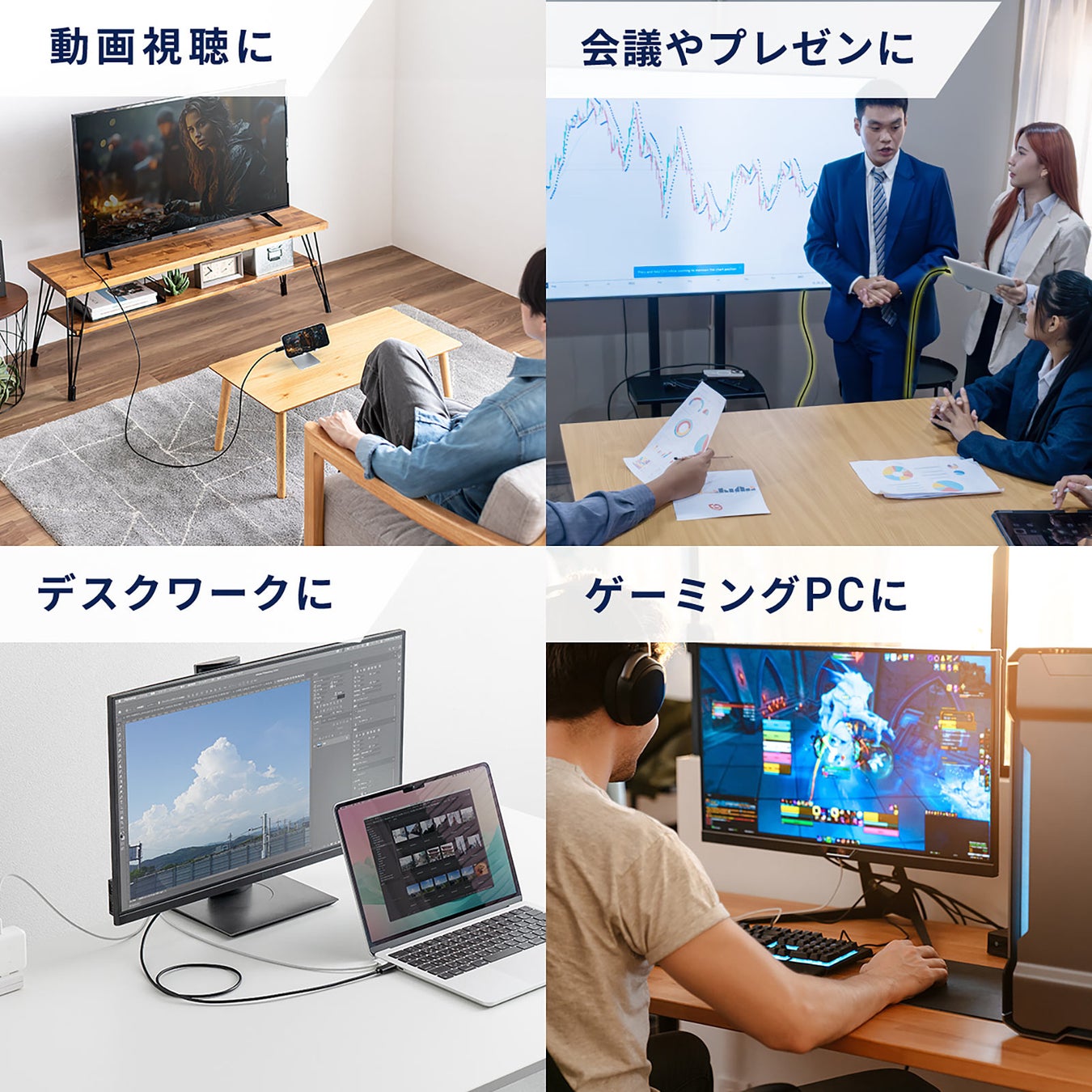 最大4K/60Hzの高解像度に対応し、映画やゲーム、プレゼン資料などを大画面で美しく表示。HDR機器との組み合わせで、明暗差や立体感も自然に表現します。自宅のテレビ、会議室のディスプレイ、出張先のプロジェクターなど、あらゆるシーンで臨場感あふれる映像体験を楽しめます。