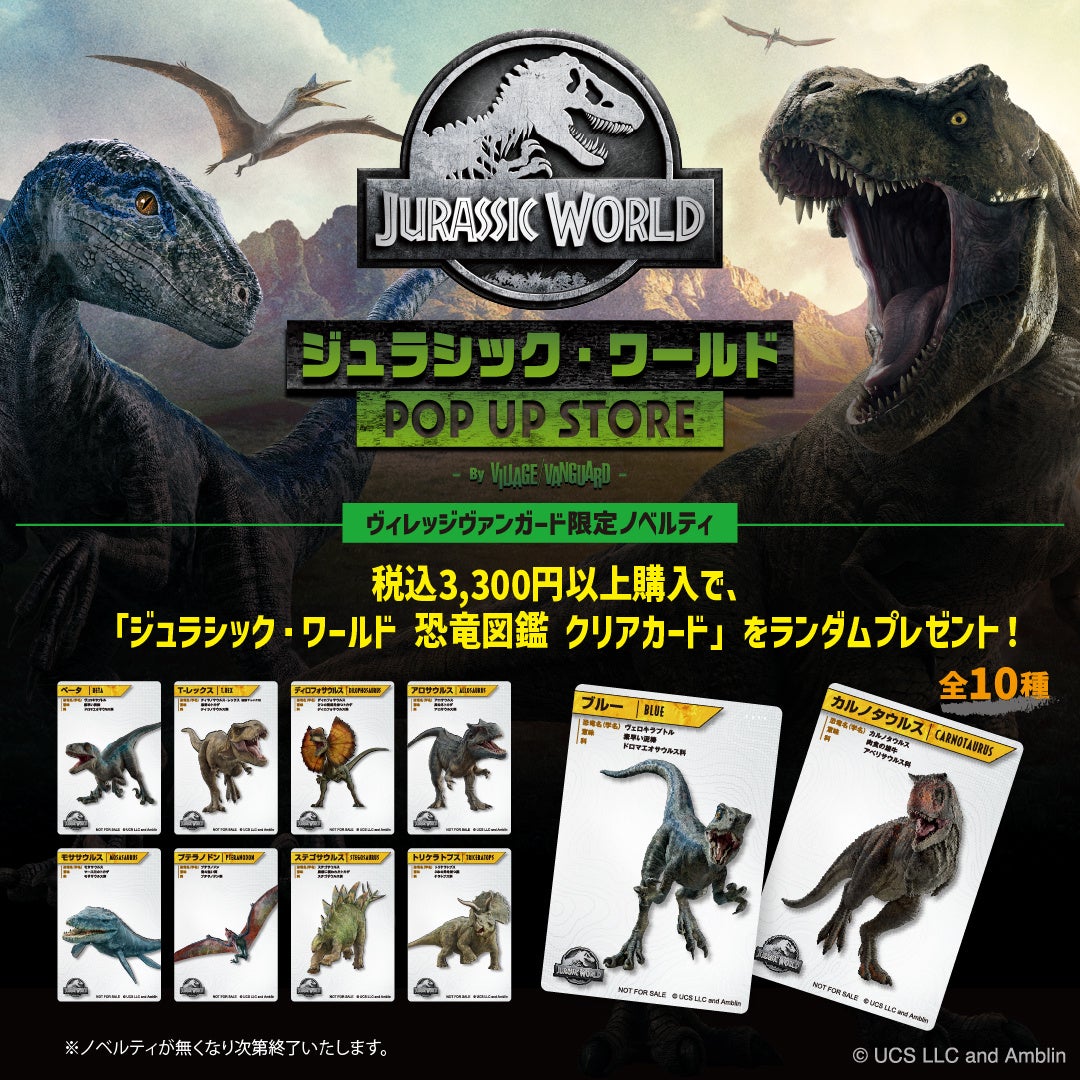イベント会場にて、税込3,300円以上お買い上げ毎に、ヴィレッジヴァンガード限定ノベルティ「ジュラシック・ワールド 恐竜図鑑 クリアカード」を全10種類の中からランダムで1枚プレゼント!