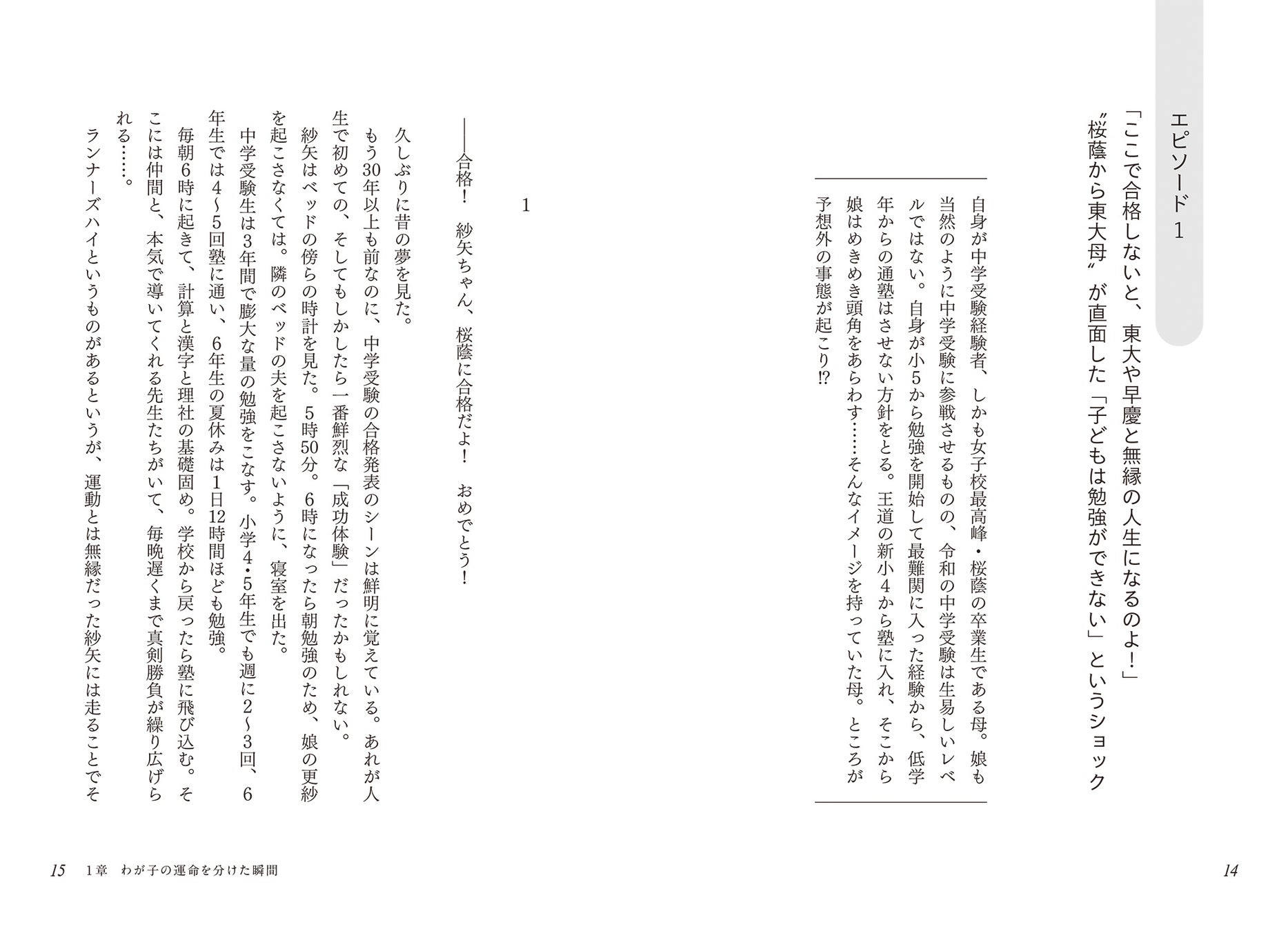1章「わが子の運命を分けた瞬間 ~6組の親子のストーリー」は、中学受験を経験した親子への取材に基づいたセミフィクションです。