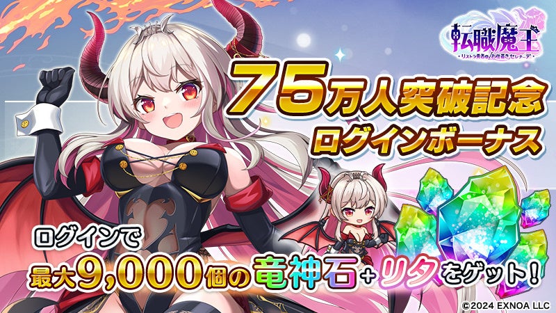 合同会社EXNOA(本社:東京都港区、CEO:村中 悠介、URL:https://games.dmm.com/)が運営するDMM GAMESは、『転職魔王~リストラ勇者のお仕置きセレナーデ~』(以下、『転職魔王』)のユーザー数が75万人を突破したことをお知らせいたします。 これを記念し、豪華アイテムが手に入るログインボーナスを実施するほか、新たな水着キャラクター「LR【水着】ジャニーヌ」が登場いたします。