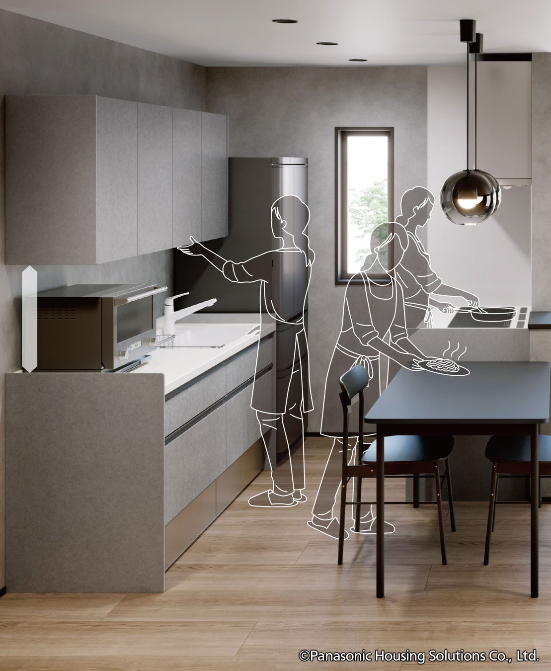 パナソニック ハウジングソリューションズでは、従来のキッチンスペースにダイニングテーブルを組み込んだ今までにないコンパクトなダイニングキッチンプラン「ハイパフォーマンスなII型対面プランのキッチン空間」の提案を2023年12月に開始しました。ダイニングテーブルをキッチン側に取り込むことでリビング空間を広くとることができ、都市型住宅やリノベーションなどに大変好評をいただいております。