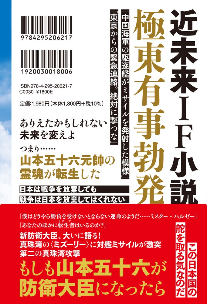 西暦203X年。海上自衛隊の護衛艦〈みょうけん〉は南太平洋のブーゲンビル島へと向かっていた。日本とブーゲンビル共和国による宇宙ビジネス計画に中国共産党が横やりを入れたあげく、ブーゲンビル住民が暴徒化し、邦人救助の命令が〈みょうけん〉に出たのである。艦長は山本三七十2佐。救助に向かう最中、中国イージス艦が放った対艦ミサイルが〈みょうけん〉に被弾、三七十は重傷を負う。夢かうつつの三七十の耳元に声が聞こえてくる「IFの世界でやり直せ」と。三七十は気を失い、目覚めたときには記憶を失っていた。彼が覚えていたのは、太平洋戦争時の連合艦隊司令長官・山本五十六としての生涯だった。よみがえった五十六は入院中に知り合いとなった蜂野洲弥生の協力で、令和の世の実状を知る。彼女は元政治家の秘書であり、五十六の野望に手を貸すことになる。ラスベガスのカジノで選挙資金を稼いだ五十六は、正体を隠したまま自立民権党から立候補して当選すると、ついに防衛大臣に就任する。ブーゲンビル島沖の一件から日中関係は改善することはなく、極東の地はいつ火を噴いても不思議ではなくなった。新防衛大臣・山本五十六は中共軍との対決に本腰を入れ始める――。