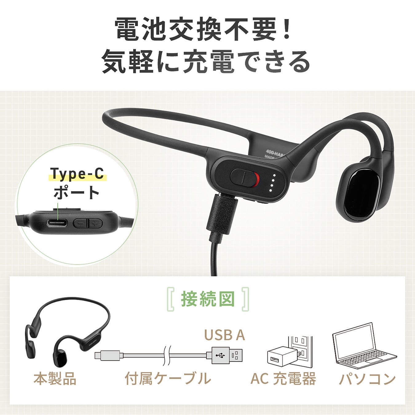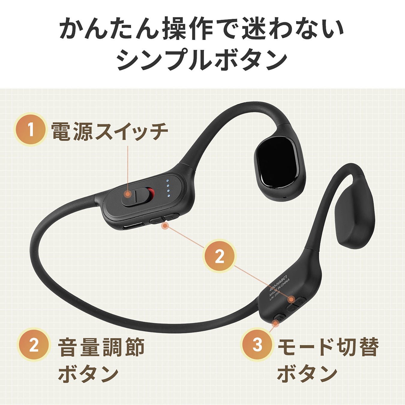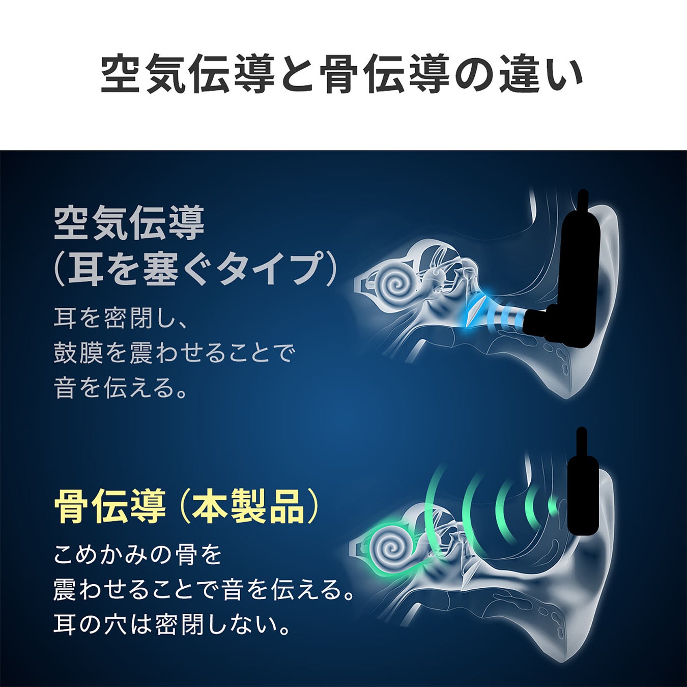 骨伝導技術を採用した「400-HABC1」は、こめかみ付近の骨を振動させて音を伝えるため、耳の穴をふさがず快適な聞こえを提供します。耳を塞ぐ集音器と比べ、構造上耳が蒸れず、通気性も良好なので衛生的です。長時間装着しても快適に使えるので、会話やテレビ視聴など日常生活のあらゆるシーンで活躍します。