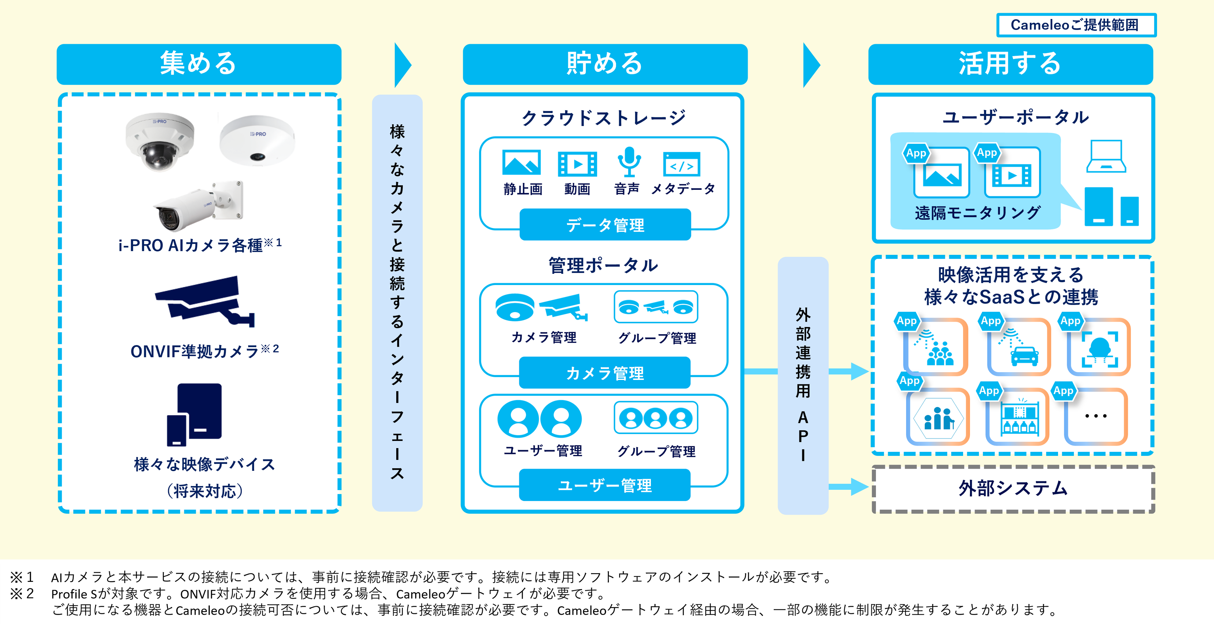「Cameleo」はビジネス向けのクラウドカメラサービスで、カメラで撮影した映像をクラウド上に録画し、PCやスマートフォン・タブレットを使った遠隔監視が可能です。また、外部連携用のAPIを提供し、蓄積したデータの活用を加速させるプラットフォームとしても活用できます。例えば、既存の業務アプリケーションや、画像認識・画像処理AIなどの外部システムと連携することで、サプライチェーンや社会インフラ、金融など多様な分野で映像活用による業務効率化に貢献します。