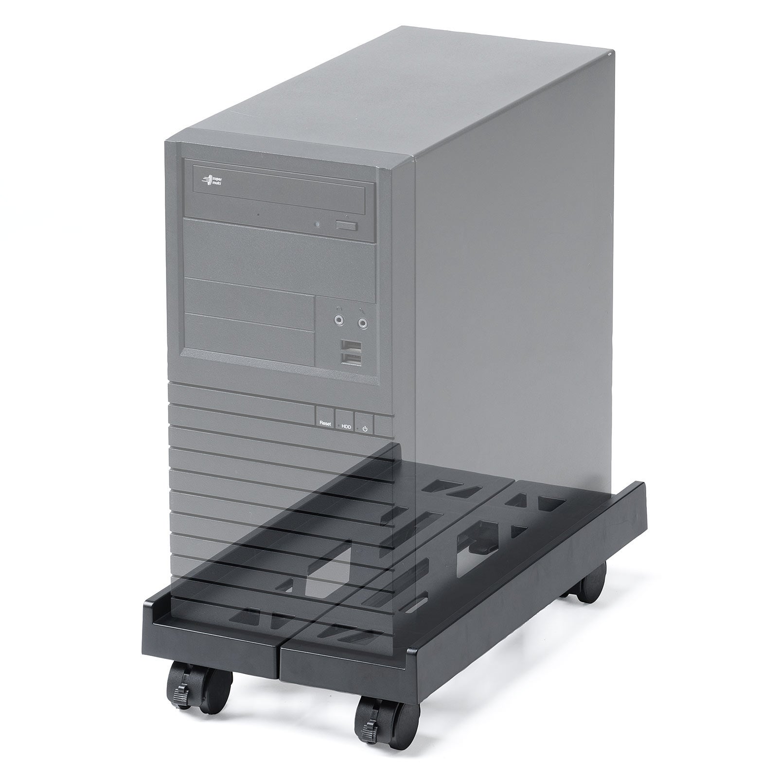 デスク下にパソコンを設置しても、出し入れや清掃がしづらい…そんな悩みを解決するのがこのPCスタンド。前輪にストッパーが付いているため、必要なときだけスムーズに引き出せて固定も簡単。床面から7cm浮かせる構造で、ホコリや熱のこもりも防ぎ、常に快適な作業環境を維持できます。