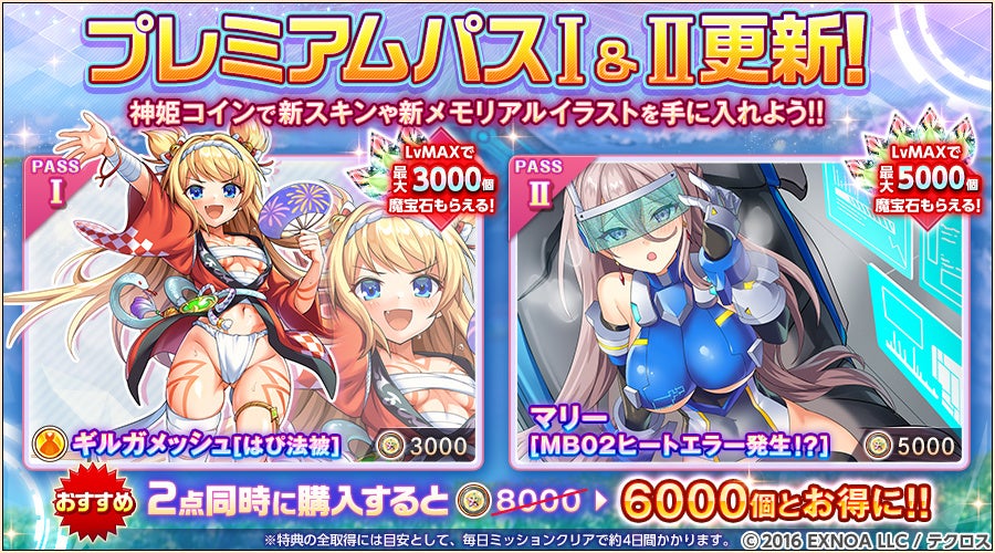 神姫コインで購入できるプレミアムパスⅠ・Ⅱの追加特典には、なんと新たな英霊スキンやメモリアルイラストも!
