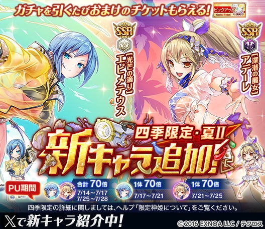 合同会社EXNOA(本社:東京都港区、CEO:村中 悠介、URL:https://games.dmm.com/ )が運営するDMM GAMESにおいて『神姫PROJECT』は、「エピメテウス」「アデーレ」が新衣装で登場する事を発表した。さらに7月7日にプレミアムパスが更新された。