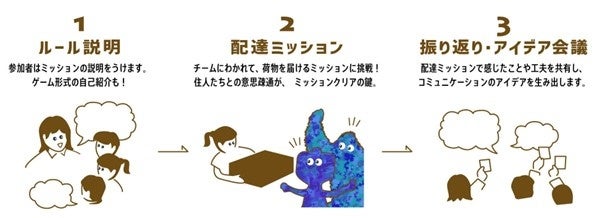 参加者は、とある架空のアパートで配達ミッションに挑戦します。ただしこのアパートに住んでいるのは、見慣れないヘンテコな生き物ばかり。音に反応しない生き物や、暗闇が大好きだったり、それぞれ変わった特徴をもった住人たちです。参加者はそんな住人の特徴や考えに創造力を膨らませ、住人たちとのやりとりに創意工夫を凝らして荷物を届けていただきます。無事全ての荷物を配達できればクリアとなります。