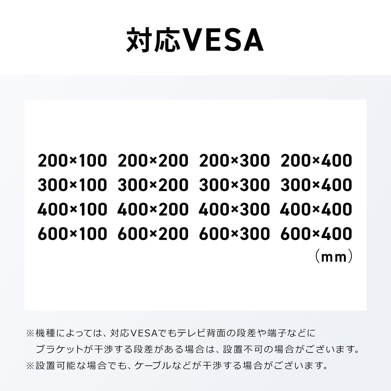 37~86型までの大型ディスプレイに対応し、最大耐荷重は70kgです。VESA規格に対応(200×200、300×300、400×300、400×400、600×400など)しており、幅広いメーカーのテレビ・モニターに取り付け可能です。