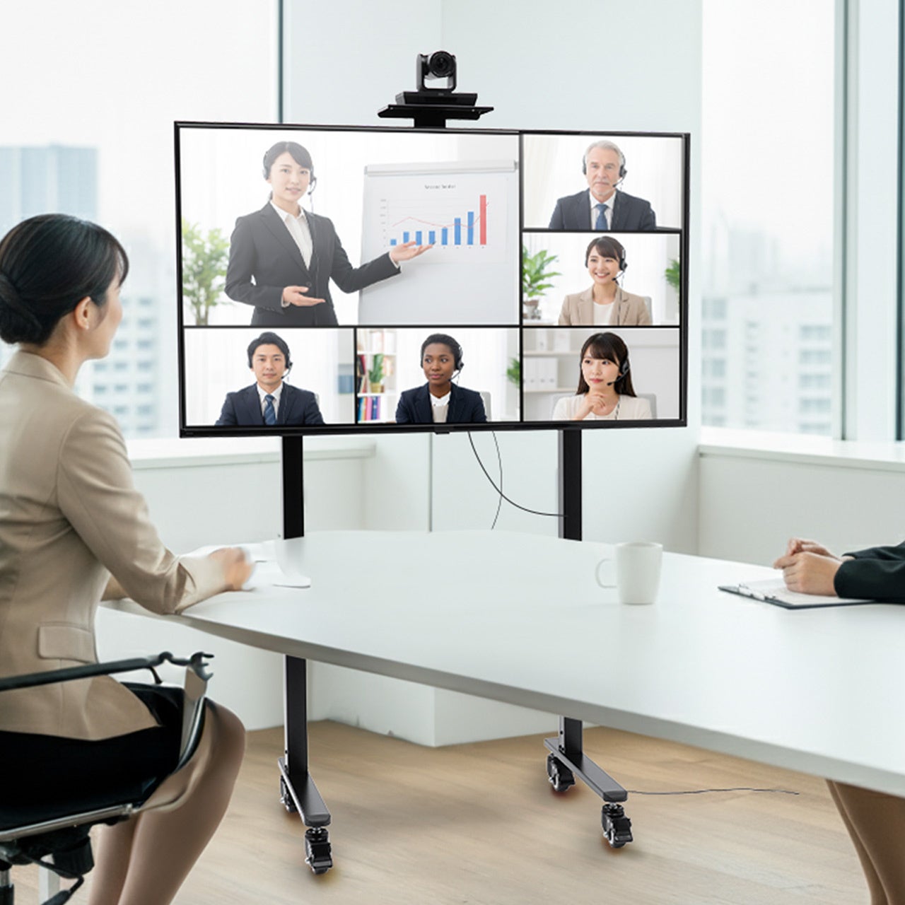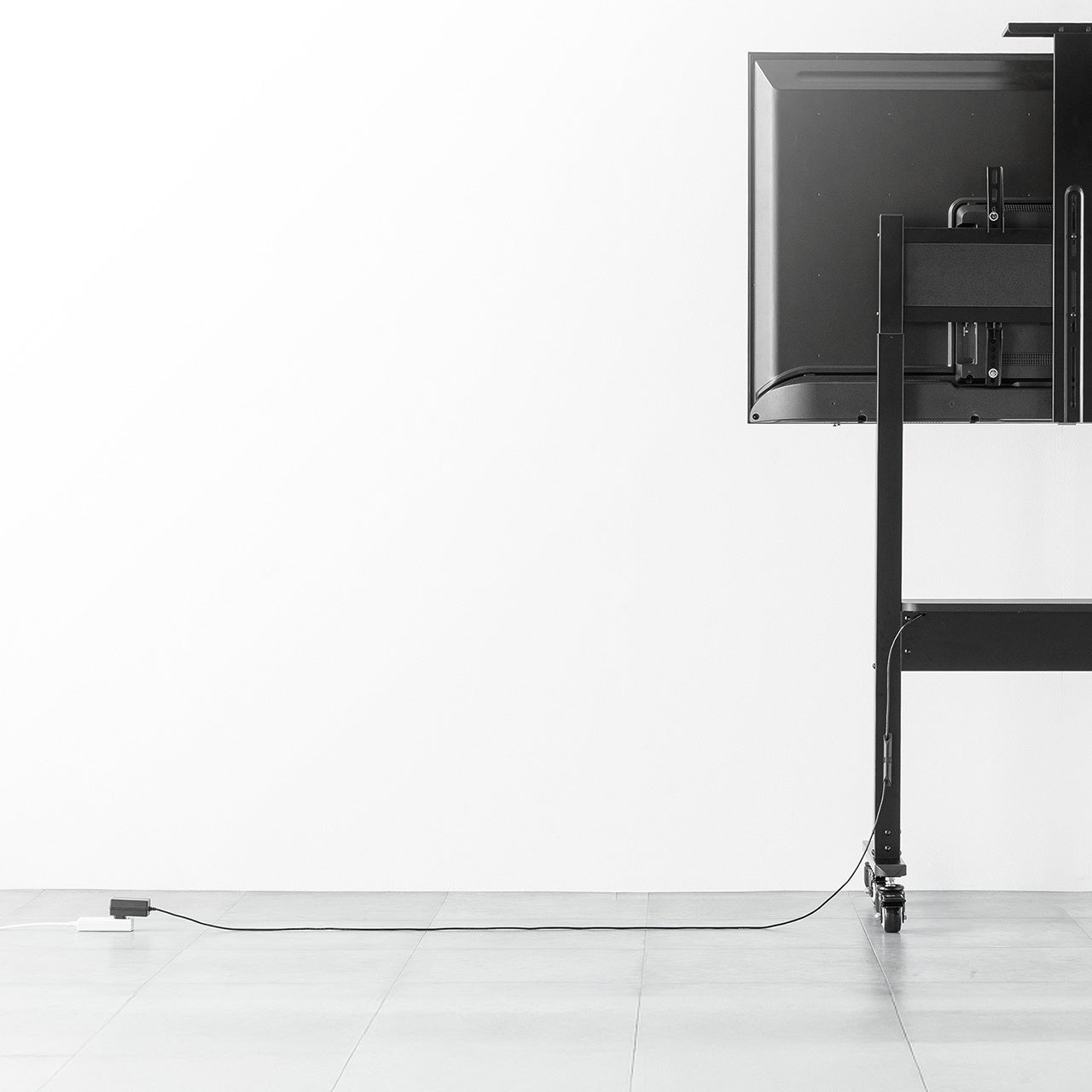本製品は、会社の会議室での大型モニター設置や、教育現場・展示会・デジタルサイネージなどで使用できる電動昇降式ディスプレイスタンドです。