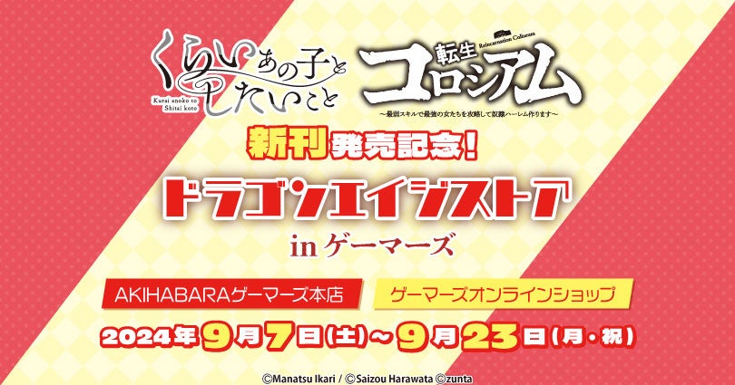 「くらいあの子としたいこと」「転生コロシアム~最弱スキルで最強の女たちを攻略して奴隷ハーレム作ります~」新刊発売記念!ドラゴンエイジストア in ゲーマーズを2024年9月7日(土)より開催致します!