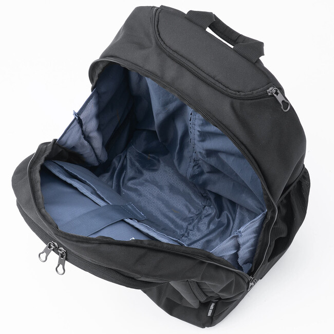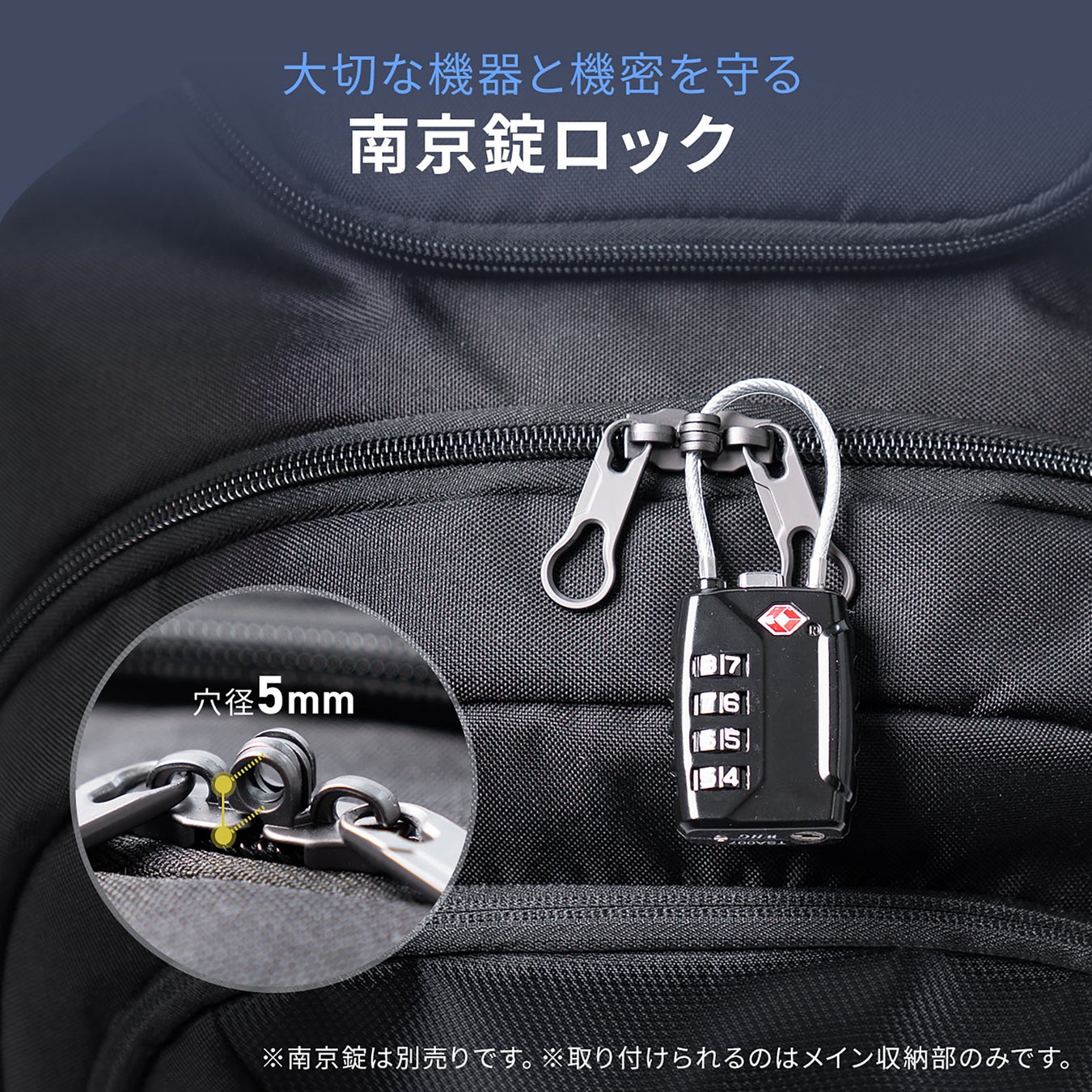 15.6型まで対応のPCポケットやタブレットポケット、小物収納に便利な多彩なポケットを装備。スマホやモバイルバッテリーもスッキリ収納できます。南京錠対応のファスナーで防犯性も高く、ビジネスシーンでも安心して活用可能です。