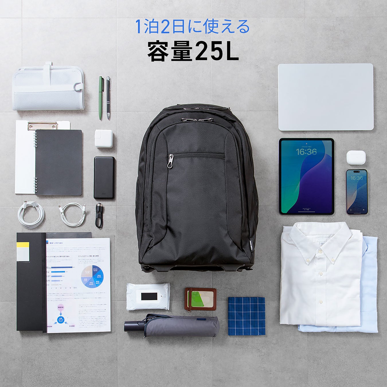 スリムな外観ながら25リットルの容量を確保。1~2泊の出張や旅行に十分対応できるサイズです。機内持込可能な設計なので、出張や週末旅行にぴったり。サイドポケットや多彩な収納で荷物を整理しやすく、使い勝手抜群です。