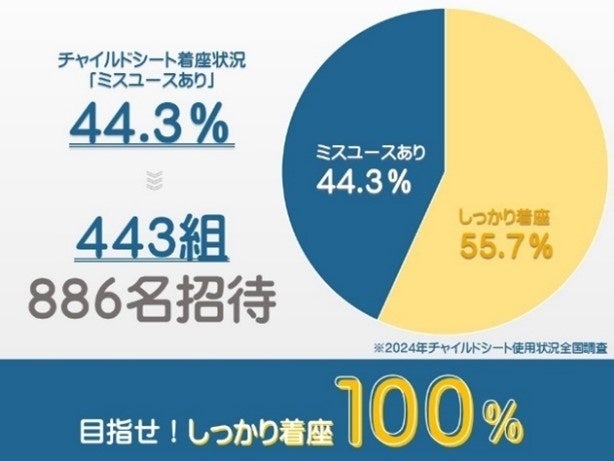 試合当日は「ファミリーデー」が開催されるため、多くのご家族連れが来場する予定です。チャイルドシート使用におけるミスユースの現状を知ってもらい、ご自身の取り付け状況や着座方法を再確認するきっかけにしていただき、「ミスユースである44.3%」を撲滅する願いを込めて、先着で443組886名を無料招待します。