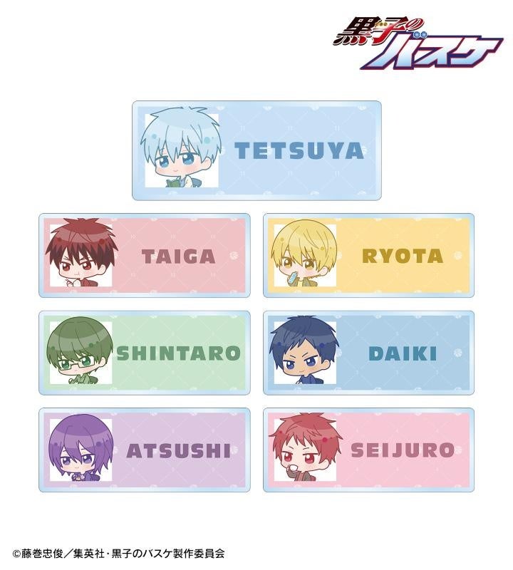 黒子テツヤ、火神大我、黄瀬涼太、緑間真太郎、青峰大輝、紫原 敦、赤司征十郎の名前の描き起こしちびキャライラストと各キャラクターの名前をメインにデザインし、アクリルネームプレートに仕上げました。