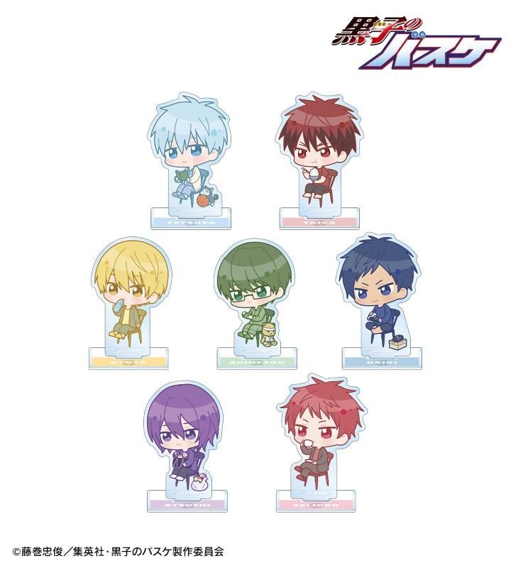 黒子テツヤ、火神大我、黄瀬涼太、緑間真太郎、青峰大輝、紫原 敦、赤司征十郎の描き起こしちびキャライラストをメインにデザインし、アクリルスタンドに仕上げました。