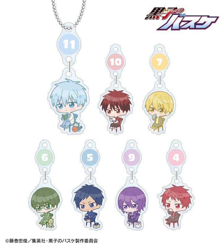 黒子テツヤ、火神大我、黄瀬涼太、緑間真太郎、青峰大輝、紫原 敦、赤司征十郎の描き起こしちびキャライラストと各キャラクターの背番号をメインにデザインし、ゆらゆら動くアクリルキーホルダーに仕上げました。