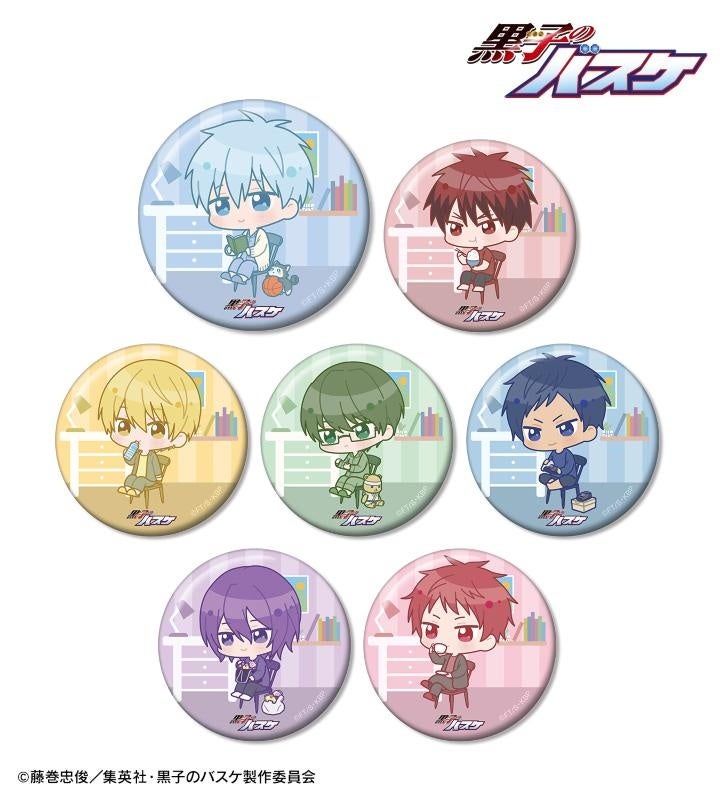 黒子テツヤ、火神大我、黄瀬涼太、緑間真太郎、青峰大輝、紫原 敦、赤司征十郎の描き起こしちびキャライラストをメインにデザインし、缶バッジに仕上げました。