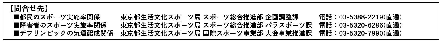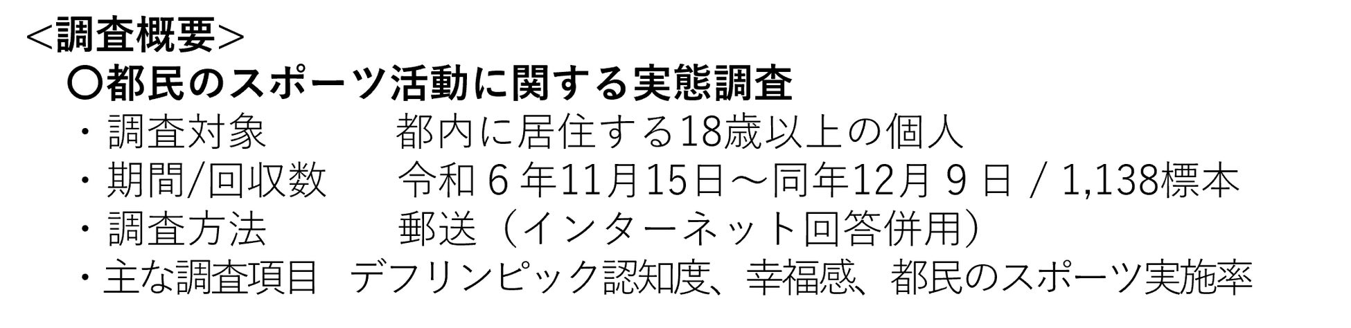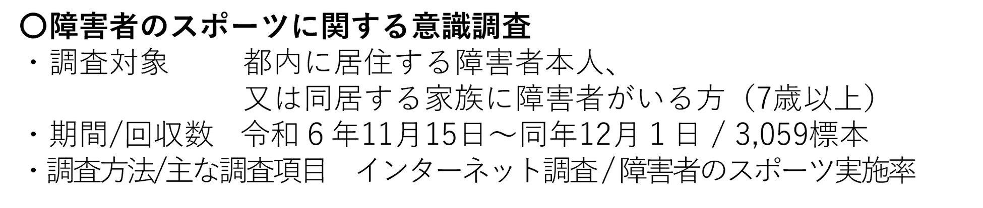 このたび「都民のスポーツ活動に関する実態調査」(令和6年11月実施)及び「障害者のスポーツに 関する意識調査」(令和6年11月実施)の結果の速報を取りまとめましたのでお知らせします。