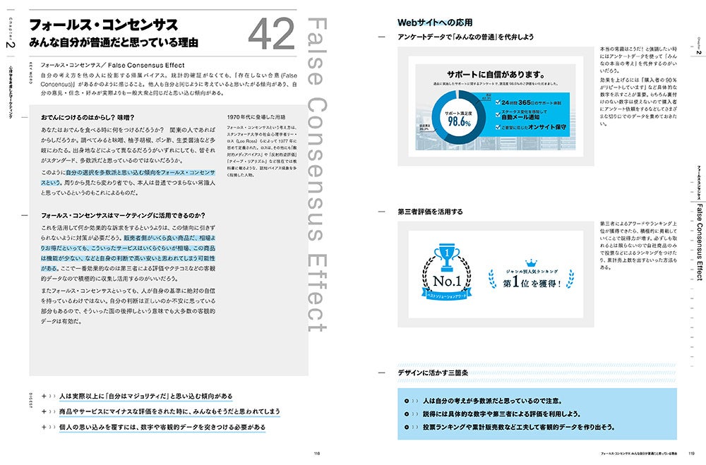 本書は「認知心理学」と「マーケティング心理学」の2つの視点から、どのような状況で人の心理に作用するかについて身近なエピソードを交えながら解説。これらの心理効果をデザインやUI、マーケティング施策に生かす実践的な方法についても紹介しています。