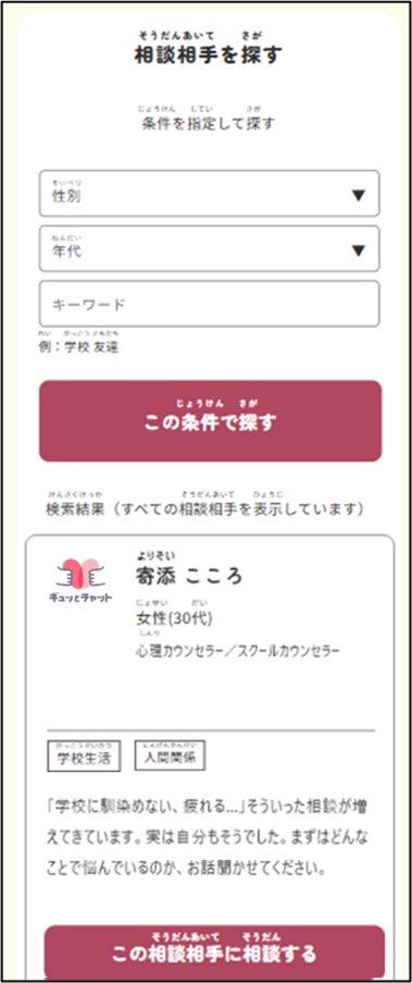 子供や子育て家庭が多様な相談相手(メンター)と気軽につながり、さまざまな不安や悩みを継続して対話できる「ギュッとチャット」をどうぞご利用ください。