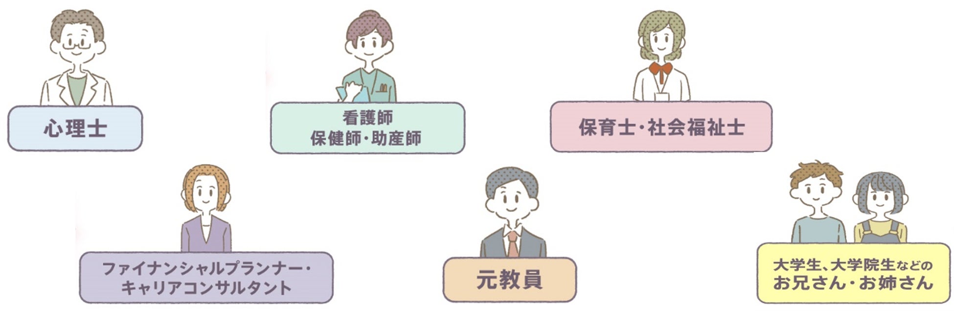 公認心理師・臨床心理士、看護師・保健師・助産師、保育士・社会福祉士、ファイナンシャルプランナー、キャリアコンサルタント、元教員、大学生・大学院生など