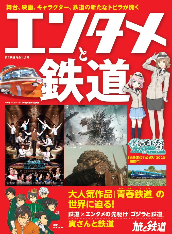 いま、鉄道を舞台としたエンタメ作品が次々と登場し注目を集めています。本誌ではこれらの作品を多数掲載しています。特集はマンガ原作から人気に火がつきミュージカル化された『青春鉄道(あおはるてつどう)』を紹介。さらに現在公開中の映画『ゴジラ-1.0』に登場する鉄道シーンをはじめ、歴代『ゴジラ』シリーズに登場した鉄道シーン、『男はつらいよ』の主人公・寅さんと鉄道シーン、『ウルトラセブン』と小田急ロマンスカーNSEなど、映像作品に登場する鉄道シーンを写真とあわせて掲載しています。また、“エンタメ鉄道”として話題の銚子電鉄、実在する鉄道事業者の制服を着て、実際にある職務の現場で活躍するキャラクターコンテンツ「鉄道むすめ」などの人気作品のほか、新時代の鉄道系YouTubeチャンネル、鉄道を舞台としたゲームや飲食店、鉄道をコンセプトとしたホテルや飲食店など幅広いジャンルを紹介します。