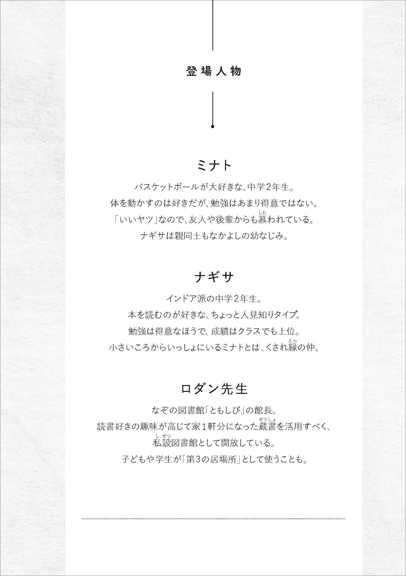 ▲登場人物は中学2年生の主人公・ナギサとミナト、そして彼らの理想的なメンター(助言者)であるロダン先生の3人。対話形式で書かれているため、読書の習慣がない人でも抵抗なく読み進められるはず