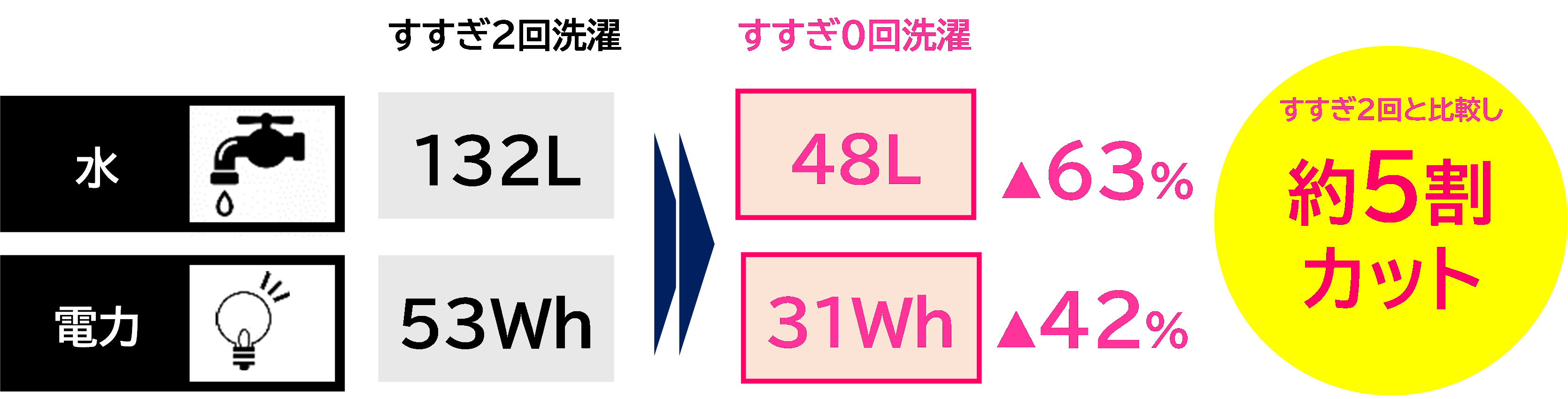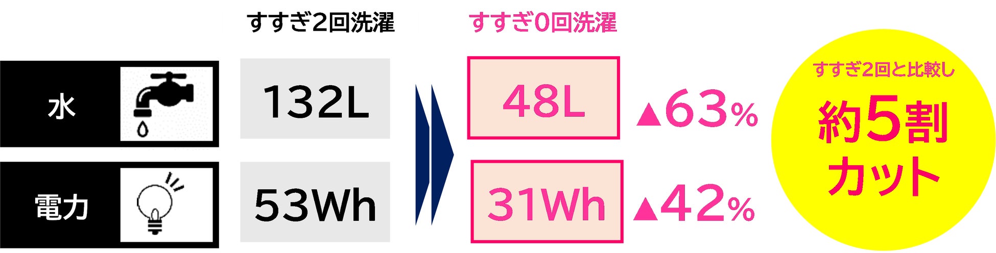 ※10:水、電力量は、国内洗濯機メーカー代表機種、衣類3kg・標準コースの平均をもとに算出(すすぎ2回に比べ0回設定の場合)