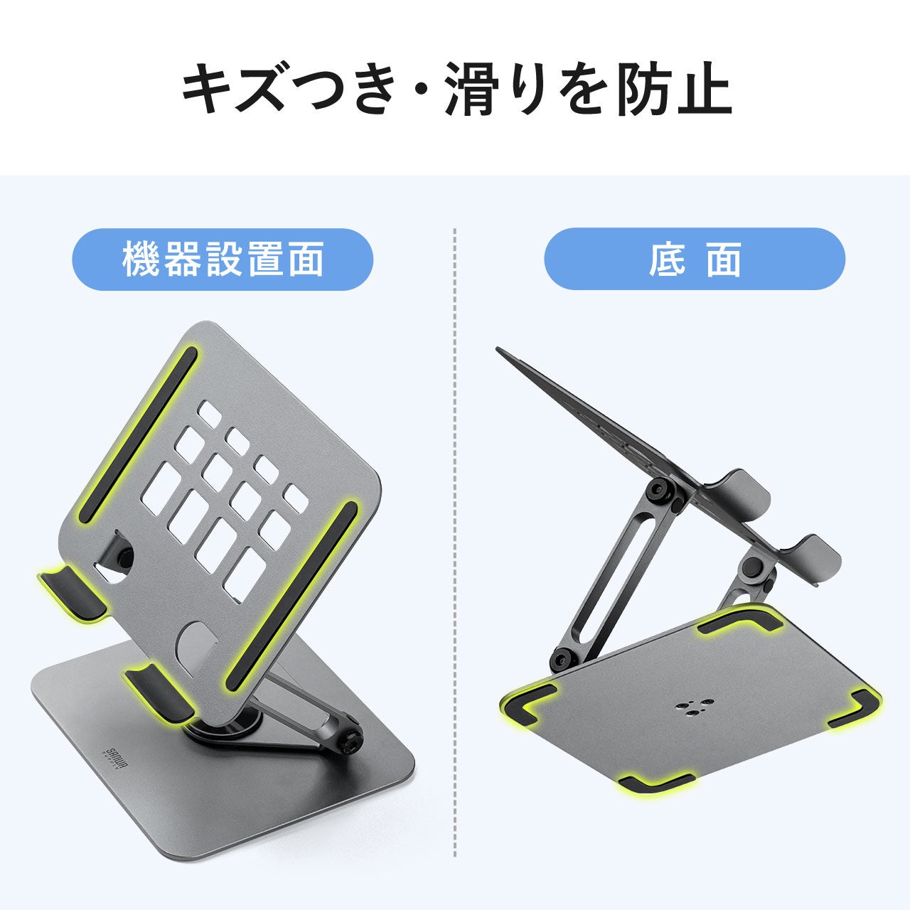 ケースを付けたままのiPadやタブレットにも対応し、設置部分にはキズ防止ゴムパッドを装備しています。底面には滑り止めラバーを採用し、操作中でもしっかり安定します。